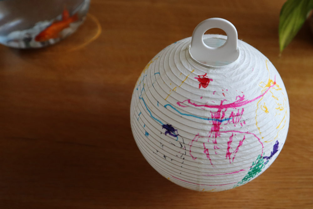 今回の描絵のレター提灯は、2歳と5歳の子が、水性ペンを使用して描いてくれました。提灯ならではの「ひご」のでこぼこ感に戸惑いながら、普段の画用紙と異なる描き心地に興味深々な様子でした。
